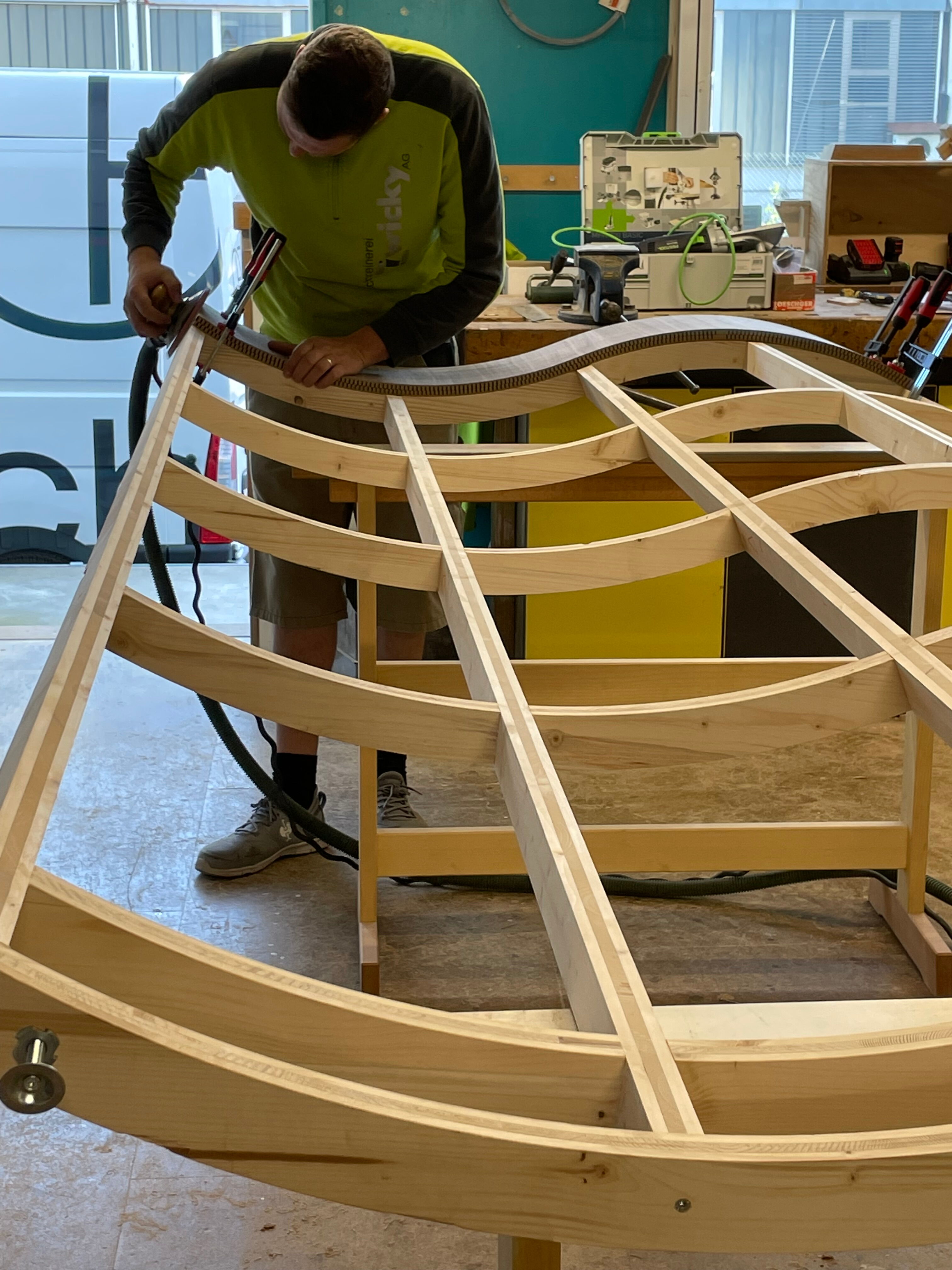 Dazu verwendeten wir schönen, einheimischen, dunklen Nussbaum. Die hellen Elemene wurden mit Jute bespannt und mit Lehmputz überzogen. Getreu dem Motto "Leimen"-Tal, was sich ja von "Lehm" ableitet.